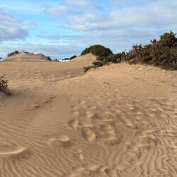 Wir verließen die Promenade und wanderten ein Stück ins Landesinnere. Der Weg führte uns entlang der letzten Strandhäuser, während die Geräusche der Ferienstadt allmählich in den Hintergrund traten und der Klang der Wellen in den Vordergrund rückte. Der Pfad war einsam und nicht gut markiert, doch das Meer blieb stets unser treuer Begleiter auf der rechten Seite, was uns Sicherheit gab.