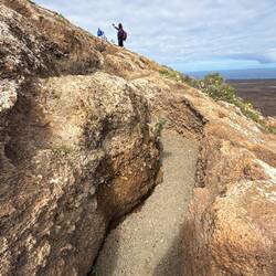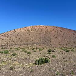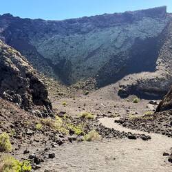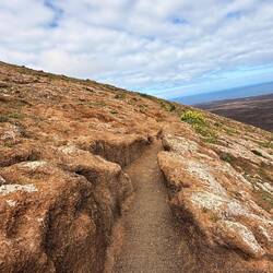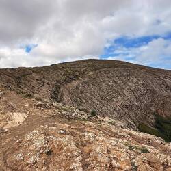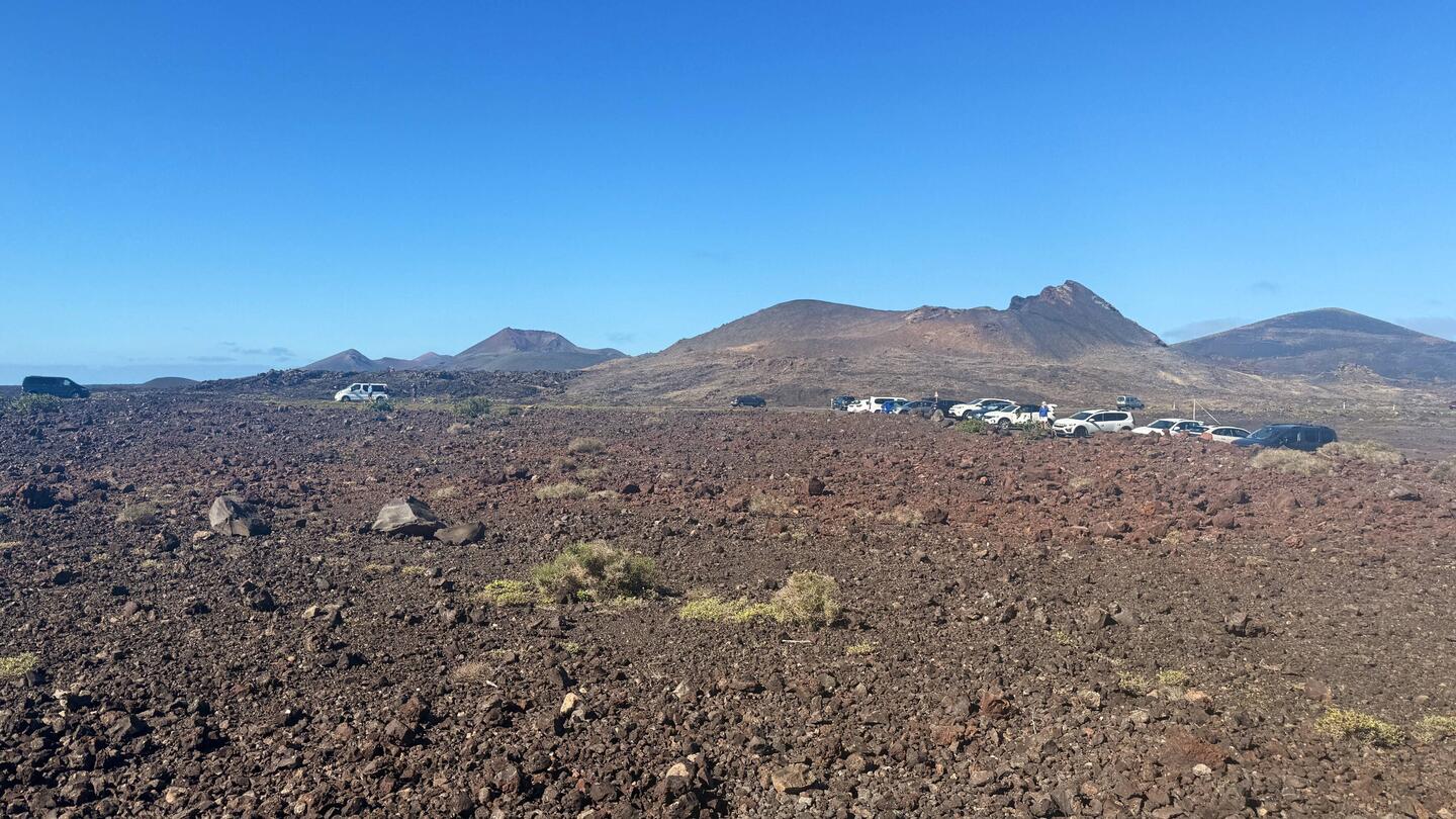 Ein bisschen später standen wir vor der Krateröffnung der Caldereta. Die Aussicht war einfach atemberaubend. Wir schauten in den Kraterkessel und fühlten uns klein, fast wie Ameisen in einem riesigen Ameisenhaufen. Der Anstieg entlang des Kraterrands zur trigonometrischen Säule der Caldera Blanca war herausfordernd, aber der Ausblick vom Gipfel war die Mühe wert. Wir hatten eine Rundumsicht, die uns den Atem raubte: im Süden die Feuerberge, im Osten die charmanten Dörfer und im Nordosten die steilen Klippen, die ins Meer stürzen.