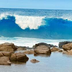 Hier kann man die Wellen beobachten, die sich sanft am naturbelassenen Strand brechen, während die Menschen in den Restaurants am Strand die Sonne genießen.