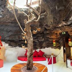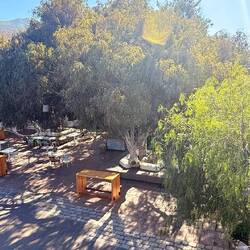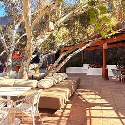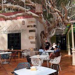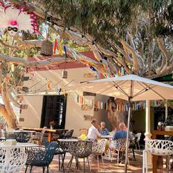 Die Bodega Stratvs auf Lanzarote ist einfach ein Traum. Dort gibt es wunderschöne Gärten, in denen man unter großen, weit ausladenden Eukalyptusbäumen sitzen kann. Diese lauschigen Plätze sind perfekt, um mit Freunden eine Auszeit zu genießen.