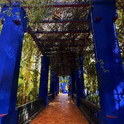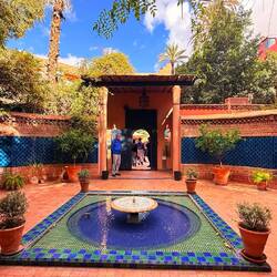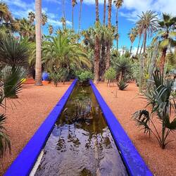 Nach der Erkundung der Medina besuchten wir den Jardín Majorelle. Dieser Garten, der einst Yves Saint Laurent gehörte, ist eine Oase der Ruhe. Die üppige Flora und die leuchtenden Farben der Pflanzen schufen eine entspannende Atmosphäre. Wir genossen die Stille und die künstlerische Gestaltung des Gartens, die einen schönen Kontrast zur Hektik der Stadt bildete.