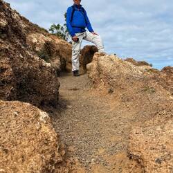 An dem Parkplatz am letzten Haus von Tenesar beginnt ein Schlackenpfad, der in einem gewissen Abstand parallel zur neu erschaffenen Küste verläuft, die durch Vulkanausbrüche im 18. Jahrhundert entstanden ist. Nach etwa 10 Minuten erreichen wir in der Nähe der kleinen Bucht El Callaito eine Fahrspur. Wir folgen ihr für etwa 100 Meter und setzen dann unseren Weg auf dem meerseitigen Pfad fort. Dieser führt in sanften Auf- und Abwärtsbewegungen durch eine ausgeglühte Lavalandschaft, in der die Vegetation kaum Fuß fassen konnte. Am Wegrand liegen beeindruckende vulkanische Bomben, und die kantige Felsenküste wird durch kleine, schwer zugängliche Landzungen und Blockstrände unterbrochen.
