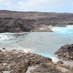 Etwa 20 Minuten nach der Fahrspur achten wir auf eine unscheinbare Gabelung, markiert durch Steinmännchen. Wir halten uns rechts und bleiben dicht am Klippenrand, da der gut erkennbar Pfad links schnell im Nichts endet. Nach zwei leicht ausgesetzten Stellen erreichen wir nach weiteren 15 Minuten den endenden Pfad an der Playa Soleta. Hier gibt es nur vereinzelt sandige Flecken, doch man kann zwischen den bizarren Lavaformationen direkt zur Wasserlinie gelangen. Nach einer wohlverdienten Rast wandern wir denselben Weg zurück nach Tenesar und lassen die beeindruckende Landschaft noch einmal auf uns wirken.