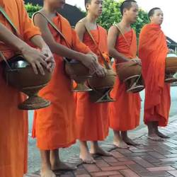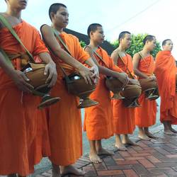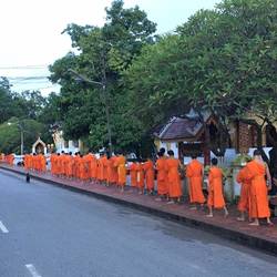 Jeden Morgen gegen 6 Uhr laufen mehrere Gruppen von Mönchen in einer Reihe durch die Straßen Luang Prabangs um Almosen einzusammeln. Die Einheimischen sitzen bzw. knien auf dem Gehweg und geben den vorbeigehenden Mönchen eine Kleinigkeit wie Reis, Gemüse oder auch andere Dinge in deren Körbe. Aber auch 'Nicht-Einheimische' dürfen dabei teilnehmen ;-)