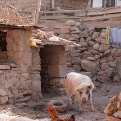 Genau aufs Zmittag sind wir zurück im Städtchen. Nach einem Menu del Dia und einem Matcha Chai Latte führt uns die nächste Etappe mit drei verschiedenen Colectivos weiter hinauf ins Tal - nach Maras. Von hier haben wir eine spektakuläre Aussicht auf das Heilige Tal und die dahinter liegenden Anden. In diesem staubigen Dorf treiben Frauen mit grossen Hüten und farbigen Röcken die Schafherden durchs Dorf. Dicke Munis und Schweine leben neben Güggel und Esel im Hinterhof. Ansonsten ist dieses Dorf angenehm ausgestorben, genau nach unserem Gusto.