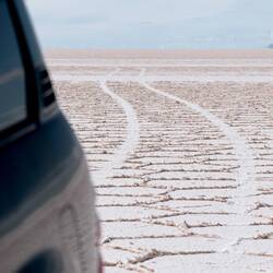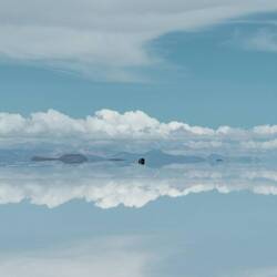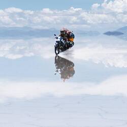 Dank des Regens in der vergangenen Nacht werden wir weiter draussen Zeugen eines seltenen Spektakels. Eine dünne Wasserschicht verwandelt die Salzebene plötzlich in einen gigantischen Spiegel, der den Himmel fast perfekt reflektiert. Das Fahren über diese Fläche fühlt sich an wie Fliegen. Die riesigen Berge am Horizont scheinen zu schweben. Was für ein Naturwunder!