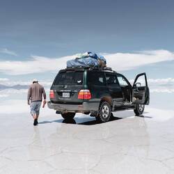 Aufgrund der dünnen Wasserschicht ist Nico jedoch gezwungen, maximal 5 km/h zu fahren, da das spritzende Salzwasser den Jeep beschädigen würde. Und so tuckern wir im Schneckentempo durch die magische Landschaft und verbringen schlussendlich 14 Stunden auf der Salzwüste – und uns wird keine Sekunde davon langweilig.
