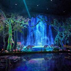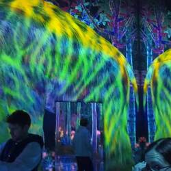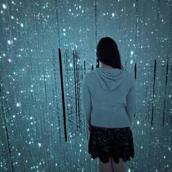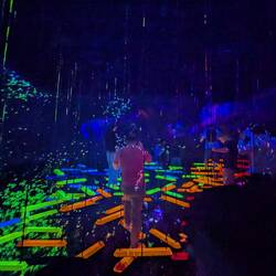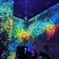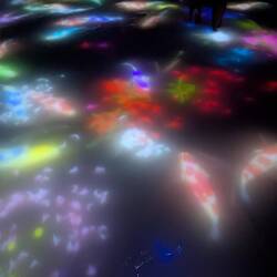 Hier sind wir gestartet. Man muss Schuhe und Socken ausziehen und lasst diese in einem Schließfach. Nun geht's erstmal durch flaches Wasser eine schräge auf eine Schräge hinauf zu einem Wasserfall. Anschließend durch einen dunklen Raum über einen kissenartigen Boden, bei deman mit jedem Schritt den Boden verschiebt und Einfluss nimmt. Anschließend geht es über lange Gänge in einen großen Spiegel Raum mit Millionen an LEDs und man taucht in das Lichtermeer ein — unglaubliches Lichtspiel. Zusätzlich kann man über die App die Lichtmuster und Farben mitbestimmen. Nun heißt es Hose hochkrempeln, jetzt geht es durch kniehohes Wasser in dem Fische schwimmen, zumindest scheint es so. Fantastisches Farbspiel. Kois schwimmen um ein herum und werden durch die Besucher angezogen oder weichen ihnen aus..immer wenn sie mit einem Besucher oder einen anderen Koi Zusammenstoßen verwandeln sie sich in Blumen die aufblühen. Das beste, das ganze ist nicht vorgerendert, sondern in Echtzeit berechnet. So ist es nicht reproduzierbar und keine Szene entsteht je nochmal genau so.