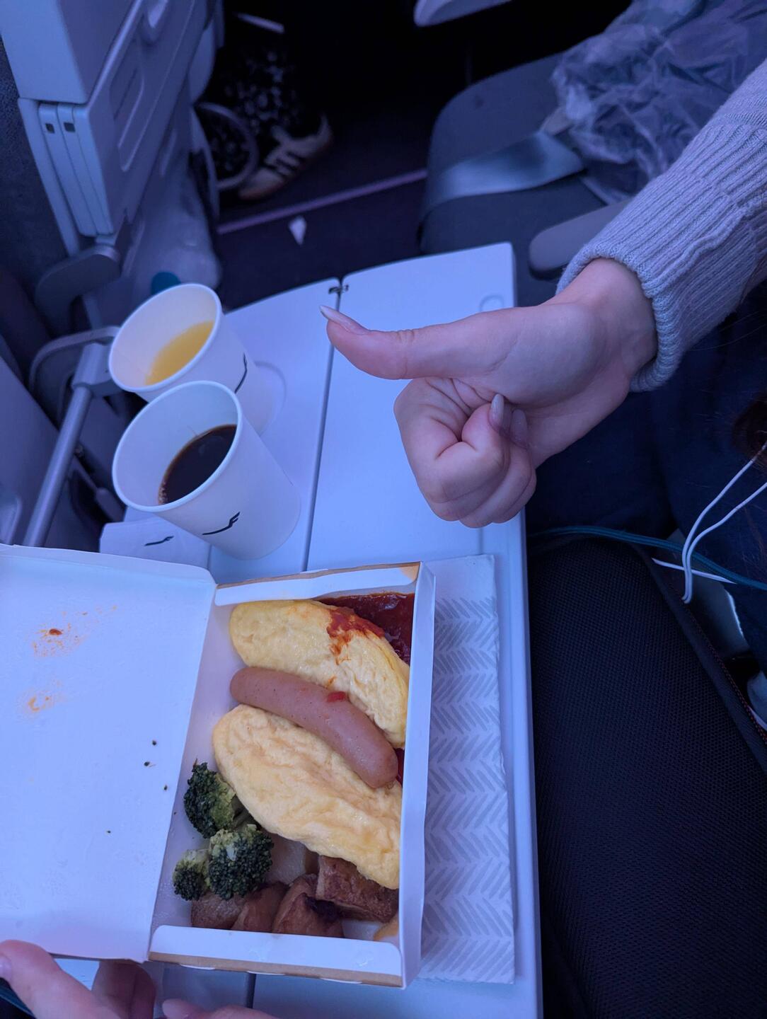 Lecker Omlet und Würstchen, dazu grüner Tee und Orangensaft.