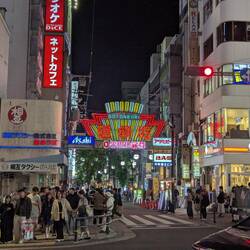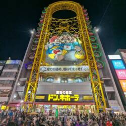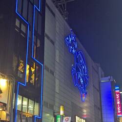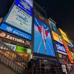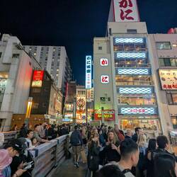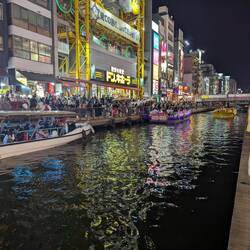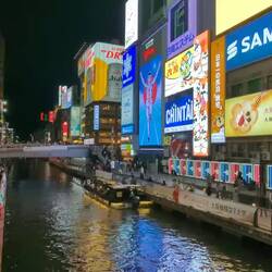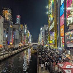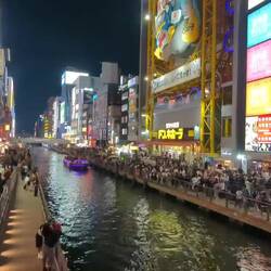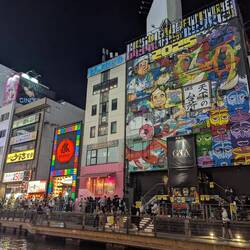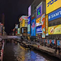 Ein großes Unterhaltungsviertel in Osaka. Viele Restaurants, Bars, Hotels und Einkaufsläden, vom Touristen Krimskrams bis hin zu Nobelmarken ist hier alles vertreten. Heut ist Sonntag und es ist voll, aber alles in Bewegung. Gerade wenn es dunkel wird kommen die Leuchtreklamen gut zur Geltung. Ne kleine Bootstour kann man hier auch machen und der ohnehin schon verrückte Laden Don Quijot - der von Snacks, Beauty-Produkte, Spielfiguren, Kochgeschirr, Koffer, über Verkleidungen, wie Anime Figuren, bis hin zu Sexspielzeug, einfach alles hat- hat hier noch ein Riesenrad um den Läden herumlaufen — Crazy!Okumaya devam et