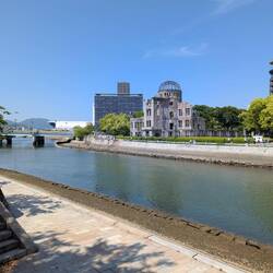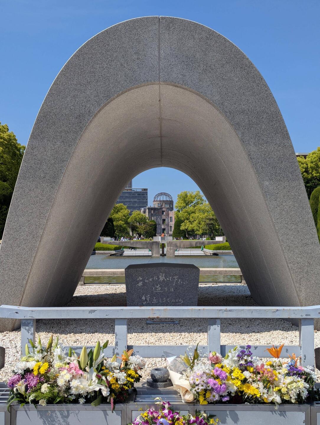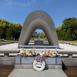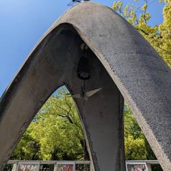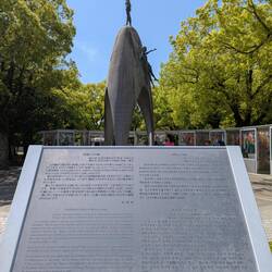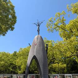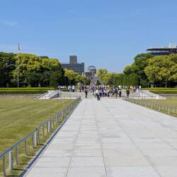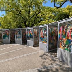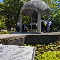 Die eine Schulklasse hat sich um die Gedenkstätte für die, durch die Bombe verstorbenen Kinder versammelt. Sie tragen etwas vor und übergeben Ketten, die aus gefalteten Origami Kranichen bestehen. An anderer Stelle leitet eine Schulklasse gemeinsam die große Friedensglocke, die mit ihrem klang die Botschaft von Frieden in die Welt hinaus tragen soll — wäre so schön wenn es klappen würde.