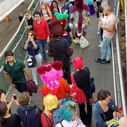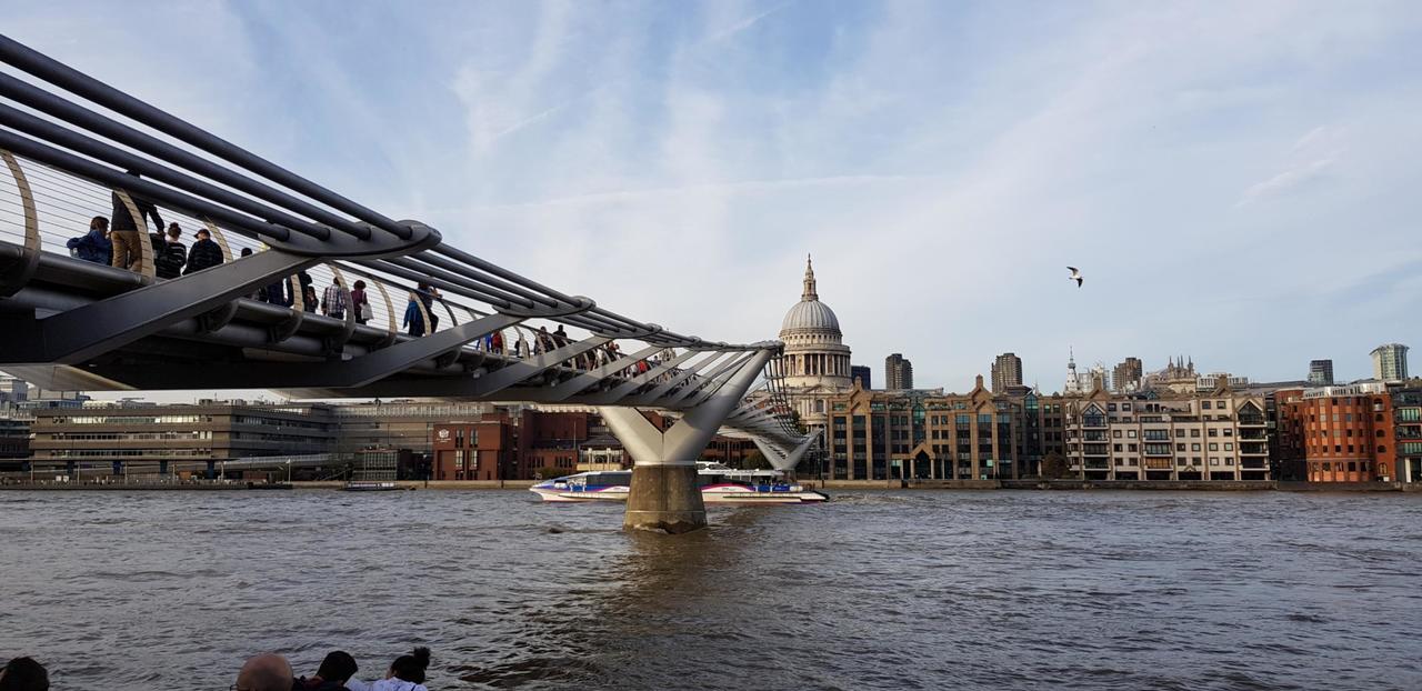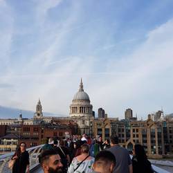 Über die Themse auf der Millennium Bridge. Mit dem Wetter haben wir echt Glück. Während wir runter geschaut haben ging eine eine riesen Gruppe Furries an uns vorbei, die wir drauf.
