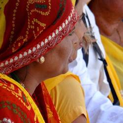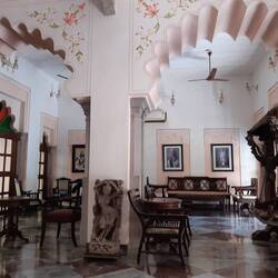 Then on to nearly 400 year old Fort Madhogarh. Owned by the King ( land owner ) of the local area, and converted to a heritage hotel in 2000. It is an imposing site high on the hill top. Sitting on sheer rock and reached by a winding climb circling the hill, we were welcomed by a red carpet. Before we entered our foreheads were anointed with a red dot and garlands of flowers placed around our necks.