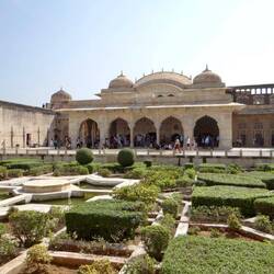Made of local red sandstone inlaid with black and white marble the octagonal building is set on a raises platform in a formal garden. It is a huge area with beautiful gardens and other tombs laid out very formally.
