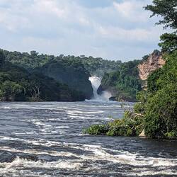 Murchison Falls (or Kabalega Falls for the Ugandan name before the Europeans "discovered" it), is on the Victoria Nile before it reaches the white Nile. The entire river is forced through a 7 meter gap at 300 cubic meters per second. This makes it the most powerful waterfall in the world, on the longest river in the world. The sheer power of the water churning when you're standing at the top of the falls is amazing, and of course you get a good drenching from the spray.
