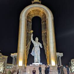 Turkmenistan also owns the world's 5th largest reserve of gas, making the regime very wealthy. The president chose to show this off by demolishing most of Ashgabat in the 90s and rebuilding it almost entirely in white marble imported from Italy. The city is made up of wide avenues lined with grand buildings made of white marble, and countless golden monuments. At night everything is lit up in bright neon colours until 4am, making it an impressive city to land in on a night flight. Many of these buildings sit empty, and for the size of the city you don't see many people or cars around giving it the feel of a ghost town in many areas. The cars that you do see are all white, because in the words of our guide, "having a white car is not a requirement, but a recommendation from the president".