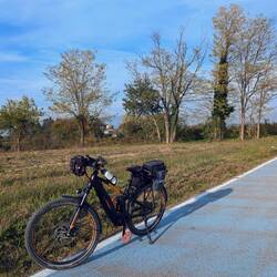 und zu mal ein kurzes Stück, das leider immer wieder viel zu schnell vorbei ist. Als letztes 'Highlight' haben wir den"Blauen Radweg". Allerdings sind wir schon kurz vor Lazise, also fast schon wieder zurück. In Lazise kaufen wir noch kurz ein und dann Endspurt. Und auf einmal gibt es neben der Straße – hier in der Gegend wirklich außergewöhnlich – einen Radweg und der ist ... tatsächlich blau. Zumindest war er das mal. Ist aber noch gut zu sehen.Read more