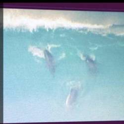 So I prepared my camera & was waiting the whole time I was standing there. I saw the shaddows again and was zooming with my camera. There were couple of dolphins comming out of the water, swimming with the massive waves.