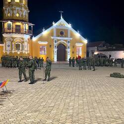 Als wir vom Abendessen zu unserem Bus zurückkommen, findet auf dem Platz vor der Kirche ein öffentliches Gelöbnis statt. Bei einer solchen Militärpräsenz fühlen wir uns gut behütet.