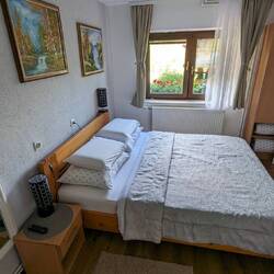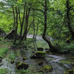 Das Haus liegt direkt an der Quelle des Flusses Buna, eine der größten und saubersten Quellen Europas. Das türkisfarbene Wasser entspringt aus einer Karsthöhle unterhalb einer steilen Felswand und schafft eine beeindruckende Kulisse.
