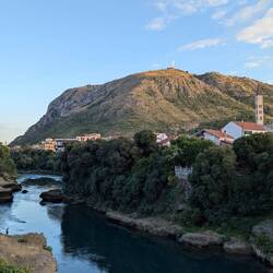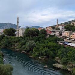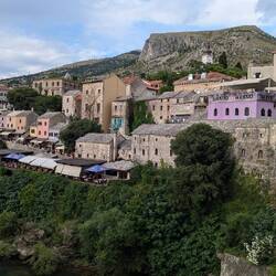 Mostar ist bekannt für seine Alte Brücke, ein Symbol der Versöhnung nach dem Bosnienkrieg. Auf der einen Seite leben vorwiegend Bosniaken (Muslime), auf der anderen Kroaten (Katholiken), was sich sehr in der Architektur widerspiegelt. Auf der einen Seite gibt es Minarette, auf der anderen Kirchtürme.