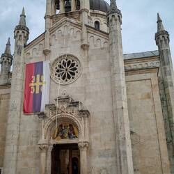 Dies ist die Namazgja-Moschee, die größte Moschee des Balkans, die gestern vom türkischen Präsidenten Erdogan bei seinem Besuch in Tirana eröffnet wurde – nach fast einem Jahrzent Bauzeit. Mit ihren vier 50 Meter hohen Minaretten und der riesigen Kuppel überragt sie alles in ihrer Umgebung – auch das Parlamentsgebäude daneben.