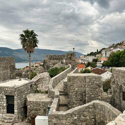 Die Promenade führte uns rasch zur Festung Forte Mare und den Überresten der Citadella, einer ehemaligen Verteidigungsanlage, die nach einem Erdbeben halb ins Meer gestürzt ist. Forte Mare wurde im 14. Jahrhundert von den bosnischen Herrschern erbaut und war der Grundstein für die Verteidigung der Stadt vor Angriffen über das Meer. Von unten kann man die Festung durch einen besonderen Eingang betreten, eine sehr steile und enge Treppe, wo sich Max direkt den Kopf gestoßen hat. Die Festung innen ist ganz nett, aber spannender ist natürlich der Ausblick. Praktischerweise konnten wir die Festung oben durch den normalen Eingang verlassen und waren direkt in der Altstadt.