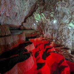 Die Beleuchtung innerhalb der Höhle war funktional, wenn auch wenig ästhetisch. Einige Bereiche wirkten wie Baustellen, insbesondere die Metallgitter, die eher unpassend zur natürlichen Umgebung waren. Doch das fließende Wasser war definitiv ein Highlight – die klaren Becken und das plätschernde Wasser verleihen der Höhle eine besondere Atmosphäre.