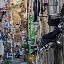 Zunächst heißt es für uns, uns in der Stadt ein bisschen zu orientieren. Mit der Metro landen wir zunächst in der Via Toledo, der bedeutendsten Einkaufsstraße, die von der Piazza Dante zur Piazza Trieste e Trento verläuft. Sie ist bekannt für ihre historischen Gebäude, Geschäfte und Cafés, aber vor allem für die schönste U-Bahn-Station der Welt, sagen die Neapolitaner. Tatsächlich, diese U-Bahn-Station ist wirklich beeindruckend. Also Via Toledo schauen, genießen, Neapel ausprobieren. Das pralle Leben Neapels haben wir aber zum ersten Mal in den Quartieri Spagnoli erlebt. Das Spanische Viertel in Neapel, "Quartieri Spagnoli", wurde im 16. Jahrhundert für spanische Soldaten erbaut und spiegelt die turbulente Geschichte der Stadt wider. Die engen Gassen und bunten Gebäude schaffen eine authentische Atmosphäre, die heute von lebhaften Märkten und traditioneller Handwerkskunst geprägt ist.