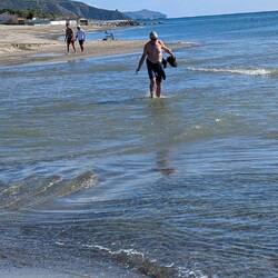 Der heutige dritte Tag ist leider ein Regentag. Es schüttet in Strömen, aber so können wir schon lang zu Erledigen des endlich angehen. Außerdem haben Ada und Nicola geöffnet. Der Tag ist gerettet. Heute kam es zu einer ganz berührenden Begegnung. Ich machte im Regen eine kurzen Spaziergang am Strand, wo ich einem alten Herrn mit Hund begegnete und mit ihm ins Gespräch kam. Er erzählte mir seine Lebensgeschichte, die von einem sehr erfüllten Leben und jetziger Einsamkeit zeugt. Wir haben lange geredet über Gott und die Welt und verabschiedeten uns herzlich voneinander. Eine halbe Stunde später stand er da mit einem Teller voller Gebäck "Per la Sua colazione" ( Für Ihr Frühstück) sagte er und fuhr davon. Am späten Nachmittag kam er nochmal und brachte selbstgemachte kleine Calzonepizza mit. "Dovete mangiarla subito, perché ancora é calda", (Ihr müsst sie gleich essen, noch ist sie warm) sagte er und weg war er. Und wir blieben sprachlos, dankbar und ziemlich betroffen zurück.