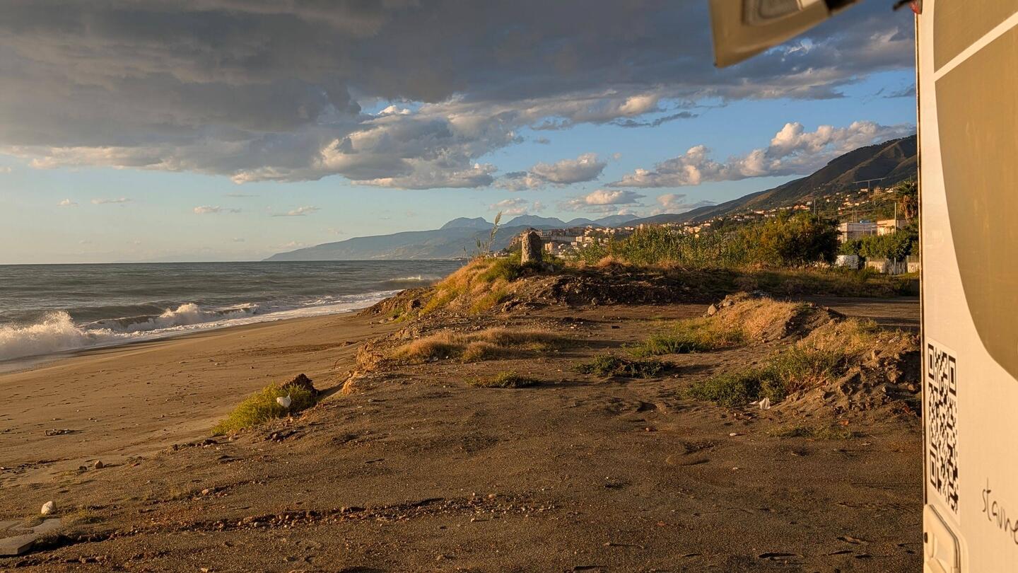 Wir finden eine feinen Übernachtungsplatz für heute in San Lucido, am Meer. San Lucido ist ein malerisches Küstendorf in Kalabrien, Süditalien, das an der Tyrrhenischen Küste liegt und für seine langen Sandstrände und die charmante Promenade bekannt ist. Die Altstadt mit ihren engen Gassen und historischen Gebäuden strahlt einen besonderen Charme aus, während im Sommer zahlreiche Feste und Veranstaltungen das Dorf lebendig machen. San Lucido bietet sich auch als hervorragende Ausgangsbasis für Erkundungstouren ins bergige Hinterland oder entlang der Küste an. Die lokale Küche ist geprägt von frischem Fisch, Oliven und regionalen Weinen, und bei klarer Sicht kann man von hier aus wunderschöne Ausblicke auf das Meer genießen.