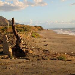 Ja, da bleiben wir. Lido Lentiscelle bei Marina di Camerota. Der wunderbare Strand zeugt natürlich vom Trubel im Sommer. Aber jetzt ist er leer. Ein paar Wohnmobile stehen da, noch funktioniert sogar die Dusche, die zu einem Strandlokal gehört, das mittlerweile außer Betrieb ist. Arbeitende Menschen sind dran, alle Lokale direkt am Strand spurenfrei zu entfernen. Jetzt bleibt nur mehr das Lokal von Ada e Nicola übrig. Die beiden haben beschlossen, das ganze Jahr über offen zu halten, sehr zu unserer Freude.