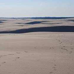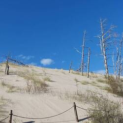 Der Weg zur Düne ist gemütlich Dort angekommen beginnt ein relativ kurzer Aufstieg auf die etwa 50 m hohe Düne. Oben wird man mit einem fantastischen Ausblick belohnt. Sandberge und -Hügel, soweit das Auge reicht, umrahmt von der Ostsee im Norden und vom Łebsko-See landeinwärts. Hier könnte man tagelang Wanderungen machen, was allerdings in diesem feinen Sand äußerst mühsam sein dürfte. Die Gegend hier sieht aus wie eine Wüste und wir bezeichnenderweise die Sahara Polens genannt.