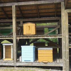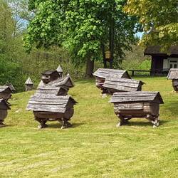 Nach dem Frühstück machen wir uns auf den Weg, um einen weiteren geringen Teil des Nationalparks zu erkunden. Heute wollen wir eine Rundwanderung von ca. 15 km machen. Auf der Strecke liegt u.a. der Ort Stripeikiai, in dem es ein Imkereimuseum gibt, das uns empfohlen wurde. Ja, dachten wir, weils grad auf dem Weg liegt, können wir es ja anschauen. Aber wieder einmal ganz große Überraschung: Ein großes Freilichtmuseum auf einer Fläche von 4 ha, sehr anschaulich und interessant gestaltet. Neben wirklich informativen Ausstellungsstücken und Stationen gibt es auch mehrere Bereiche einfach zum Entspannen und Seele baumeln lassen und sogar ein kleines Cafè gibt es, was hier in Litauen wirklich erwähnenswert ist, weil es außerhalb der wenigen Städte weder Cafés noch Restaurants gibt.