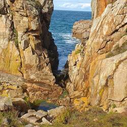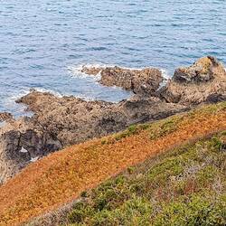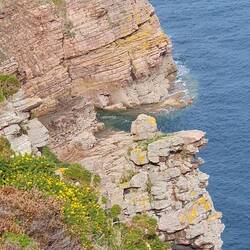Die Klippen des Cap Frehel bestehen aus rötlichem Sandstein, schwarzem Schiefer und dem von der Cotè de Granit Rose berühmten rosa-farbenen Granit. Sie fallen steil zum Wasser hin ab und haben eine Höhe von bis zu 70 m. Die Wiesen, die das Kliffdach bedecken, haben auch jetzt im Herbst noch einen besonderen Reiz. Hier wachsen Stechgingster und Heidekraut.