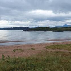 Schließlich geht es weiter zu unserem Übernachtungsplatz an der Firemore Beach am Loch Ewe. Da ist ein Riesenplatz über einem der schönsten Strände mit rosafarbenen Sand. Wunderschön. An einem Zaun hängt sowas wie ein Schlüsselschränkchen. Da soll man 10£ pro Nacht einwerfen. Weil es so schön ist, sind wir auch gleich heute dageblieben.