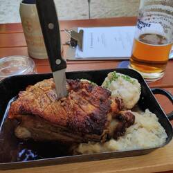 Noch zu erwähnen wäre, dass ich gestern meinen bayrischen Tag auch noch mit einem bayrischen Abendessen beendet habe. Es gab gebackenes Schäufele mit Kraut, Knödeln und Bockbiersauce.