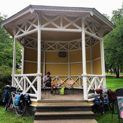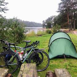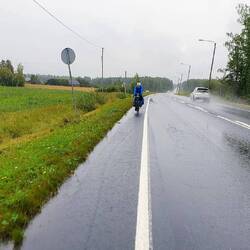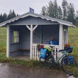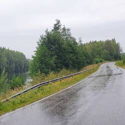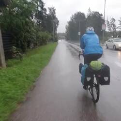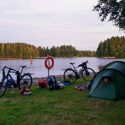 Viel zu spät kommen wir los, es ist bereits 13:00 Uhr. Naja. Bis Muurame gibt es einen Radweg. Hier machen wir nach 17km bereits Mittagspause. Und dann heißt es Gas geben. Der Weg führt zum Teil auf Gravelstrasse neben der E36 entlang. Doch bald zweigen wir ab auf eine kleinere Straße, hier geht es hoch und runter und an vielen Seen vorbei. Ist schön, aber die Hügel sind wir nicht mehr gewöhnt. Und dann kommt der Regen, erst nur ein Tröpfeln. Pause gibt es in einem Buswartehäuschen. Der Regen wird jetzt schlimmer, wir haben gerade noch rechtzeitig gestoppt, doch wir müssen noch weiter. Also alle Regensachen anziehen: Jacke, Hose und Gamaschen, so bleibt man trocken. Der Regen lässt wieder nach, aber wir suchen jetzt trotzdem ein Übernachtungsplätzchen. An einer ehemaligen Fähranlegestelle werden wir fündig, noch kurz ins Wasser und ab ins Zelt. Als wir drin sind kommt wieder mehr Regen. Aber jetzt sind wir sicher.
