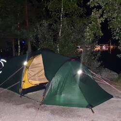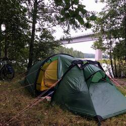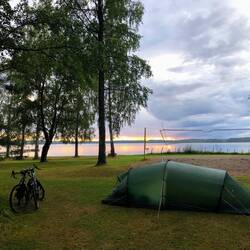Kurz vor Lahti sieht es stark nach Regen aus, wir haben aber Glück & bekommen nur ein paar wenige Regentropfen ab. Kurz vor Lahti suchen wir die Halbinsel auf, auf welcher sich früher ein Campingplatz befand. Diesen gibt's es allerdings nicht mehr & so sind wir heute die einzigen Gäste auf der grossen Wiese 😉. Hüpfen kurz ins Wasser (auch dieses schien uns die letzten Tage noch wärmer) um uns frisch zu machen, dann geht's noch zum Schnellimbiss. Beim Zelt aufstellen herrscht bereits dunkle Nacht, da kommt es uns entgegen, dass wir den Standort schon vorher genau markiert hatten.