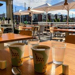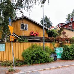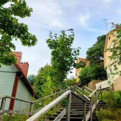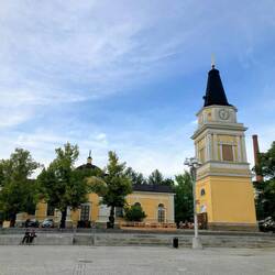🗒️Heute bewölktes Wetter am Morgen. Wir frühstücken im Zelt und los gehts. Am Wasser gehts der Bucht (auf Finnisch 'lahti') entlang und vorbei am Hafen und hübschen modernen Cafés zu den Skisprungschanzen. Hier kann man im Sommer im Auslauf der großen Schanze in einem 50m Becken schwimmen. Sehr sportliche Atmosphäre in der ganzen Stadt, am Wochenende finden die Half Ironman Weltmeisterschaften statt. Auch wir treffen heute eine Athletin: Silke, die Schwester eines Freundes aus Freiburg nimmt ebenfalls am Wettkampf teil. Im Schwimmbecken sind dann auch bereits zahlreiche TriathletInnen am Trainieren. Auch wir ziehen ein paar Bahnen. Nebenher kann man an der mittleren Schanze die Skispringer beim Training beobachten. Im Anschluss gehts in die Sauna. Das gehört hier dazu, auch die Kinder vom Schwimmkurs sitzen in der Hitze, ganz normal. Das tat gut, mal Arme bewegen und danach entspannen. Die Sonne kommt raus. Mit Silke zusammen gehts ins Café Oskari. Ein hübsches, altes Holzhaus in der ansonsten nicht allzu schönen Innenstadt. Die Auswahl an Kuchen ist groß und es gibt lecker Vanillesauce dazu. Quatschen mit Silke übers Radfahren, Triathlon und vieles mehr. War schön sich zu treffen und wir drücken für Samstag ganz feste die Daumen! Wir drehen noch eine Runde durch die Stadt, picknicken am Marktplatz und beobachten das Treiben.