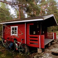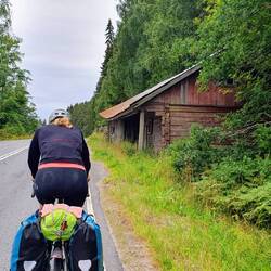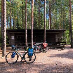 Heute scheint die Sonne und mit neuer Energie treten wir in die Pedale. Müssen erst einmal 27km wieder zurück bis zum Punkt, wo wir gestern ins Auto gestiegen sind. Aber da es eine sehr schöne Strecke ist und heute bei Sonnenschein alles anders aussieht macht das gar nix. Es hat einige Überschwemmungen gegeben, müssen eine große Pfütze durchqueren, die Felder sind zum Teil voller Wasser und die Gräben rechts und links der Straße zu Bächen angeschwollen. Wir düsen voran, heute gibts die erste Pause erst nach 55km, ein Picknick auf einem Spielplatz. Dann eine kurze Besichtigung der Kota in der wir ursprünglich gestern übernachten wollten, aber sind froh dass es anders kam. Eine Kota ist eine runde Holzhütte mit einer Feuerstelle in der Mitte. Solche Plätze gibt es hier öfters in Finnland. Und nochmal 50km weiter im schnellen Tempo. Die Strecke heute relativ flach und mehr Landwirtschaft mit offenen Flächen und das beste, die Sonne scheint immer noch☀️. Da es heute so gut läuft beschliessen wir bei einem kurzen Kaffeestopp, noch bis zum Meer zu fahren, also noch mal knapp 50km. Es geht bisschen mehr hoch und runter und über Brücken rüber. Die Landschaft verändert sich. Wieder mehr Felsen und da ist es, das Meer. Befinden uns in Finnland zum ersten Mal am Meer, bisher waren es immer Seen. Steuern ein Lavuu an einer Badestelle an. Ein Lavuu ist ein von drei Seiten geschlossener Shelter mit Feuerstelle davor, auch dies findet man öfters in Finnland. Als wird dort ankommen sind wir nicht alleine, das Lavuu ist schon belegt mit einer tschechischen Familie mit Baby und ein polnischer Radfahrer, den wir schon in Tampere kennengelernt hatten, ist ebenfalls da. Naja, an schönen Plätzen ist man nicht alleine. Auch die Mücken sind da. Wir dachten eigentlich, die sind wir los... Was nun? Erst mal ein Bad. Wieder Salzwasser, aber nicht so kalt wie wir dachten. Und nun? Kommen mit der tschechischen Familie ins Gespräch, so erfahren wir, dass es oben am Felsen noch eine offene Hütte gibt mit zwei Räumen. Hier können wir übernachten, in der anderen Seite zieht der andere Radfahrer ein, so haben alle ein Plätzchen. Kochen noch, richten uns ein und schlafen.