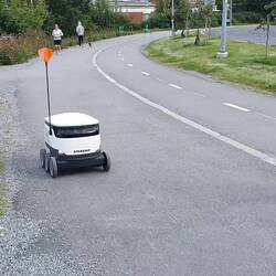 Wir erkunden alles mit dem Fahrrad, die Wege sind gut ausgebaut, sogar einen extra Fahrradkreisverkehr entdecken wir. Und wir begegnen einem kleinen Roboterwagen vom Supermarkt. Er fährt eigenständig Lebensmittel aus, spannend. Zur Übernachtung sind wir am Campingplatz. Ca. 5km außerhalb, mit dem Rad gibt es eine schöne Strecke am Wasser entlang in die Innenstadt.