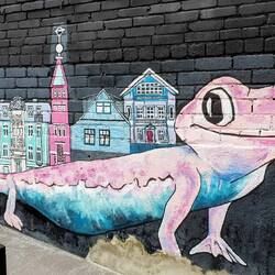 🗒️Haben gut und ruhig geschlafen. Morgens scheint die Sonne und das Zelt ist trocken. Können also alles direkt einpacken. Genießen ein Frühstück draußen mit Blick auf die Holzstämme im Wasser. Und schon wieder kommt eine neue Ladung Holz herangeschwommen. Mit Seilen wird es mit Hilfe eines Bootes an den anderen Stämmen befestigt. Wir lesen etwas nach. Varkaus ist über Kanäle mit mehreren Seen verbunden. Hier spielt das Holz eine große Rolle, es gibt Papierfabriken, Sägewerke und Zulieferer. Eine Arbeiterstadt. Bei der Weiterfahrt gehts noch am Taipalekanal vorbei und durch die Innenstadt. Hier mal wieder ein schönes Graffiti an einer Hauswand, was es in Finnland öfters gibt. Oft mit Bezug zur Stadt.