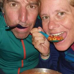 Steffi stellt Zelt auf während Markus einkaufen geht, danach kochen wir in der Campingküche Fajitas.