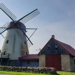 Wir fahren durch viel Wald, Wiesen & Landwirtschaftsflächen. Auf den Feldern finden sich oft die für Saaremaa typischen Steinmauern aus runden Natursteinen. Ab & zu sehen wir ehemalige Windmühlen (heute jedoch öfters ohne die Windräder) sowie die in regelmässigen Abständen errichteten hohen Sendemasten: Auch diese Insel ist, wie ganz Estland, extrem flach.