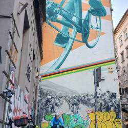 Die Einfahrt nach Budapest ist gut, nicht zu viel Verkehr und meist auf Radwegen. Stärken uns kurz vor dem Zentrum noch mit einem kleinen, schnellen Picknick, im Wind wird es schnell kalt. Kommen direkt am Parlamentsgebäude rein in die Stadt, ein sehr schöner, imposanter Bau. Der erste Eindruck von Budapest ist gut. Hatten versucht, mal wieder eine warmshower-Unterkunft zu organisieren, aber da keiner geantwortet hat, müssen wir nun erst mal eine Wohnung suchen. In einem gemütlichen Café recherchieren wir und werden schnell fündig. Auf der Ostseite der Donau (Pest), im alten jüdischen Viertel beziehen wir unsere Airbnb Wohnung. Direkt vor der Tür ein hübsches Graffiti mit einem Radrennen, das passt ja gut. Und auch die Wohnung gefällt uns sehr, eine unser besten Unterkünfte.