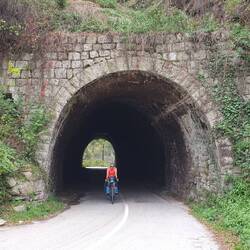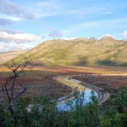 Heute folgen wir dem Ćiro-Trail, einem Radweg von Mostar bis zur kroatischen Grenze, der zu grossen Teilen auf der alten Bahnstrecke zwischen Mostar & Dubrovnik (in Betrieb von 1906 bis 1976) verläuft. Teilweise sind dies nur Velostrecken, teilweise kleine Nebenstrassen mit kaum Verkehr. Super schön! Zu Beginn verläuft die Route entlang dem Fluss Neretva, u.a. mit dem eindrücklichen Zusammenfluss mit dem Fluss Buna beim Bunski Kanal. Wir fahren mal durch ein Flusstal, mal am Rand einer grossen Ebene entlang, mal Kulturland, dann wieder Busch & Gestrüpp. Kurz nach Mostar folgt mal wieder eine Begegnung mit Hunden: Bei einem Fabrikgelände lungern etwa 5 Hunde rum, wissen nicht, ob dies Wachhunde oder Streuner sind, jedenfalls rennen alle auf die Strasse als wir uns nähern & bellen wie wild. Nicht ganz so angenehm. Wir versuchen jedoch entspannt zu bleiben & radeln einfach ruhig weiter. Die Hunde bellen & fauchen zwar, aber lassen uns passieren. Ebenso ein weiterer einzelner Hund wenig später vor einem kleinen Supermarkt. Ansonsten sehen wir heute nur ein paar Katzen & Autofahrer, die uns teilweise anerkennend hupen oder uns zuwinken. Während der ersten knapp 40km bis Čapljina passieren wir immer wieder kleine Dörfer oder einzelne Gebäude. In Čapljina machen wir Picknickpause & unterstützen auch die lokale Pekara mit einer Spende😉, kurz danach müssen wir uns entscheiden: Folgen wir der ehemaligen Bahntrasse, welche jetzt auf grobem Schotter durch ein paar dunkle Tunnels führt oder nehmen wir für etwa 20km die kaum befahrene, asphaltierte Nebenstrasse? Was man so liest & sieht, bedeutet die Bahntrasse wohl aufgrund des groben Schotters analog zu gestern viel Schieben - wir entscheiden uns deshalb für die Strasse. Auch die ist sehr schön, führt zuerst ebenfalls über eine alte Stahlbrücke, welcher schon einige der alten Bodenbretter fehlen, danach steigt die Strecke fast 400 Höhenmeter an, teilweise mit ekligen 14% Steigung. Steffi lehnt die Zigarette, die ihr zur Unterstützung von einem Autofahrer angeboten wird, dankend ab. Weiter geht's dann auf einer Art Hochebene, attraktive Landschaft, keine Zivilisation, nur hin & wieder ein altes, verfallenes Bahnhofsgebäude. Die Fauna wir zunehmend mediterran, Palmen, Agaven, Granatapfelbäume & trockenes Gestrüpp werden zahlreicher. Gefällt uns beiden super & zeigt uns erneut, dass Bosnien & Herzegowina sehr viel zu bieten hat!