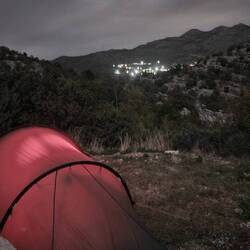 In Ravno gibt's wieder wenig Zivilisation, u.a. ein Hotelrestaurant, in welchem wir uns einen Cafe gönnen & uns im WC erfrischen. Inzwischen ist es dunkel, wir fahren noch etwa zwei Kilometer mit Stirnlampe weiter bis zu einem der wenigen Rastplätze entlang des Ćiro-Trails. Dieser besteht zwar primär aus einer asphaltierten Fläche, aber hinter der Stützmauer Richtung Tal gibt es auch noch ein paar Quadratmeter Gras. Die genügen uns & hier stellen wir nach fünf Nächten in fünf unterschiedlichen Unterkünften endlich wieder unser Zelt auf. Geniessen eine tolle Aussicht über die Ebene & auf die andere Talseite, der Vollmond guckt teilweise zwischen den aufkommenden Wolken hindurch & gibt uns beim Kochen Lichtunterstützung. Wir beschränken uns auf eine heisse Suppe, Brot, Käse & Apfel. War ein schöner Tag, leider unsere letzte Nacht in Bosnien & Herzegowina.