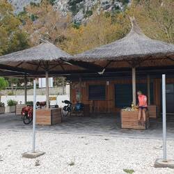 In Makarska gibt's in einer Bar feinen Cappuccino, in der Bäckerei feines Gebäck. Frisch gestärkt geht's weiter in die Steigungen 2 & 3 des heutigen Tages, eindrückliche Aussicht in die Stein- & Steilküste Dalmatiens, angenehme Anstiege & böige Abfahrten. Kurz vor Omiš machen wir Mittags-Picknickpause an einer sich bereits im Winterschlaf befindlichen Beach Bar.