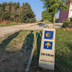 The walk today was marked by the first time in Spain that I've seen fields of sunflowers in bloom. That's always a smile-maker. Also I passed into the province of León, and completed the half-way point on this amazing Camino. The terrain was generally gentle rolling hills, or flat. The towns were cute and easy to navigate.